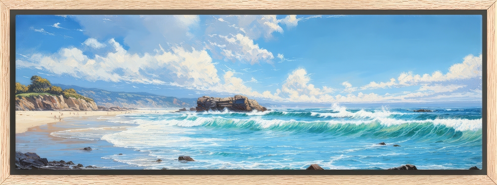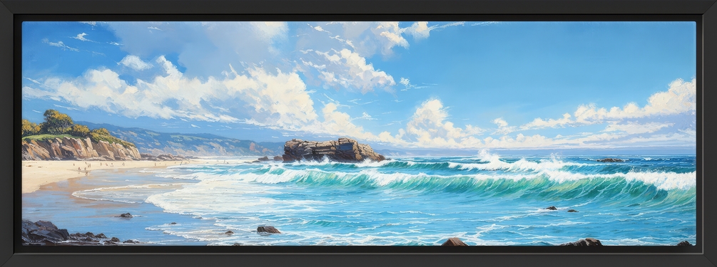 "Coastal Symphony" is a captivating digital art piece that encapsulates the serene beauty of a beachscape. This artwork showcases a vivid display of crashing waves and sandy shores under an expansive sky streaked with delicate clouds. The dynamic brushstrokes give life to the water’s movement, creating a rhythmic play between the sea and sky.